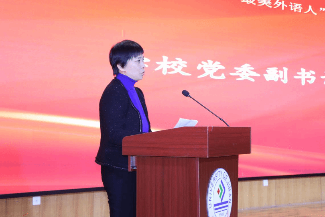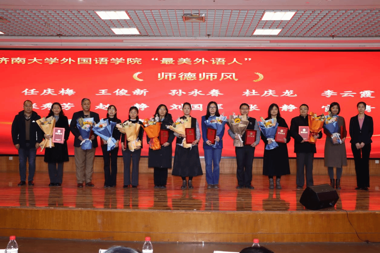 随后,获奖教师代表发言:英语系王磊老师,法语系李真老师,日语系薛桂谭老师依次上台发言。他们表示,将在未来工作中继续努力,教学质量上不断提升,科研水平上追求卓越,为问鼎(中国)高质量发展贡献自己的一份力量。