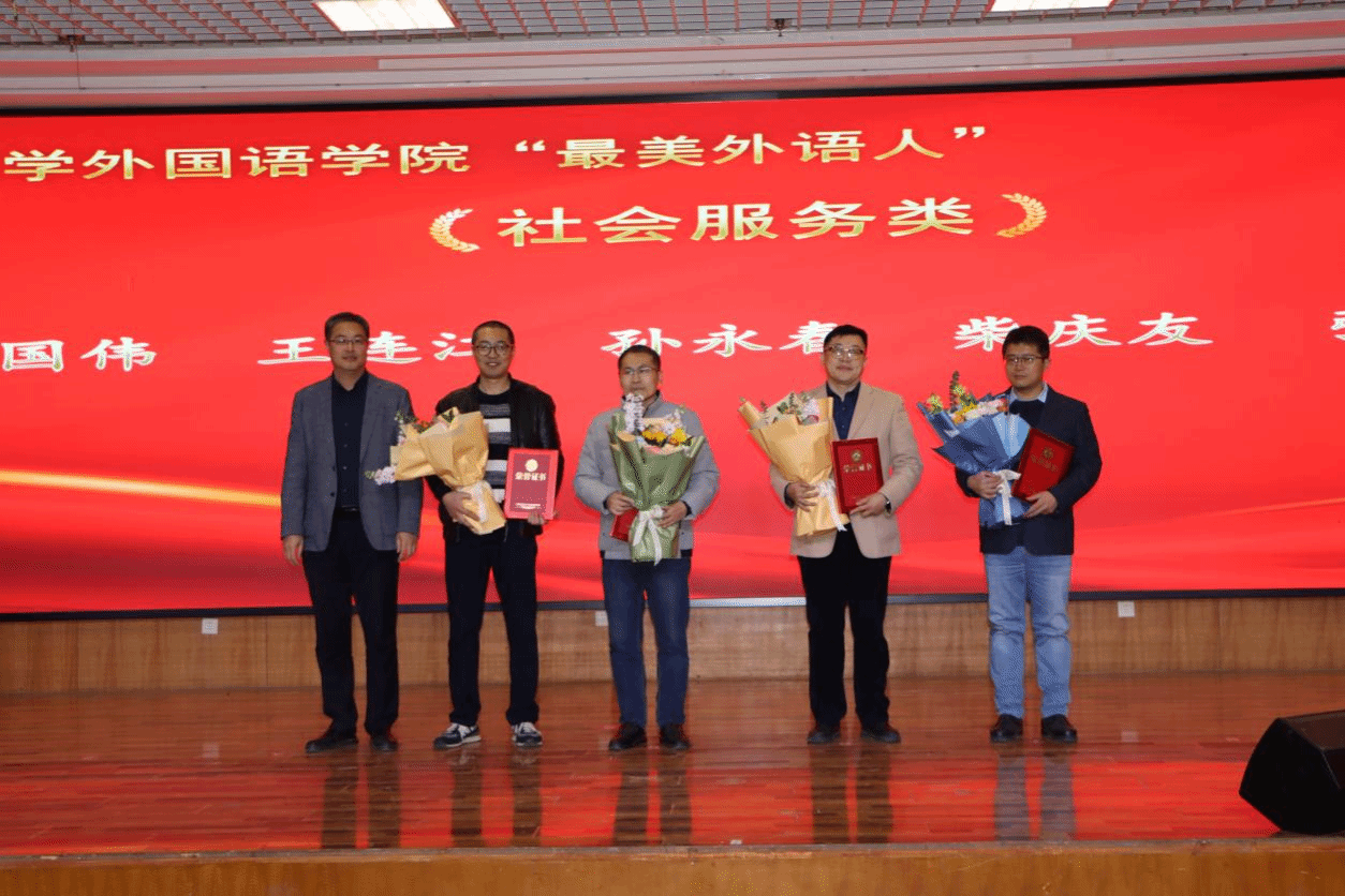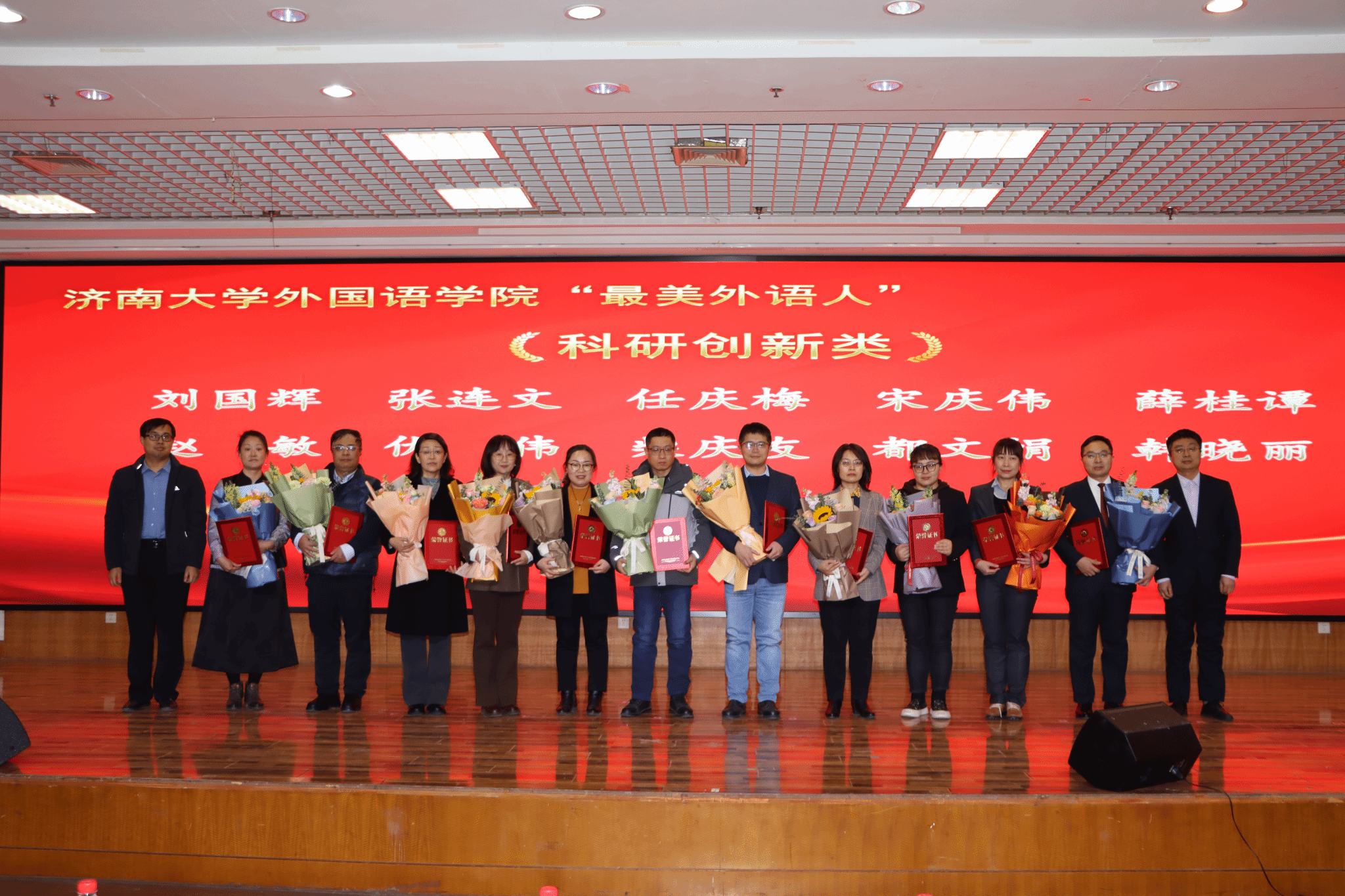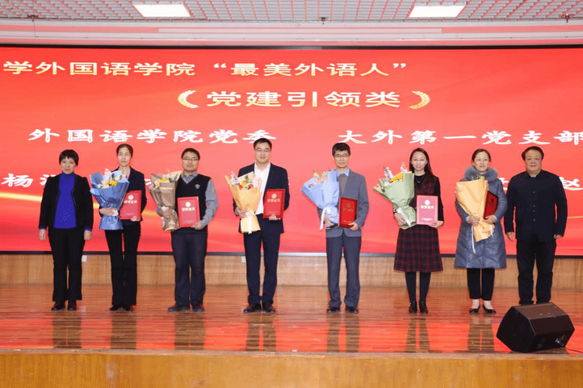学校党委副书记商华,济南大学特聘教授、上海交通大学问鼎(中国)教授刘建军为党建引领类“最美外语人”颁奖。