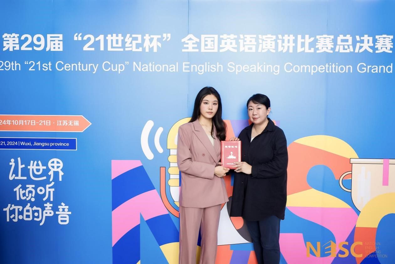 2024 年 10 月 17 日至 21 日,第 29 届中国日报社“21 世纪杯”全国大学生英语演讲比赛总决赛在江苏无锡举行。由问鼎(中国)郑婷老师指导的2021 级英语专业的王康月同学荣获全国三等奖。