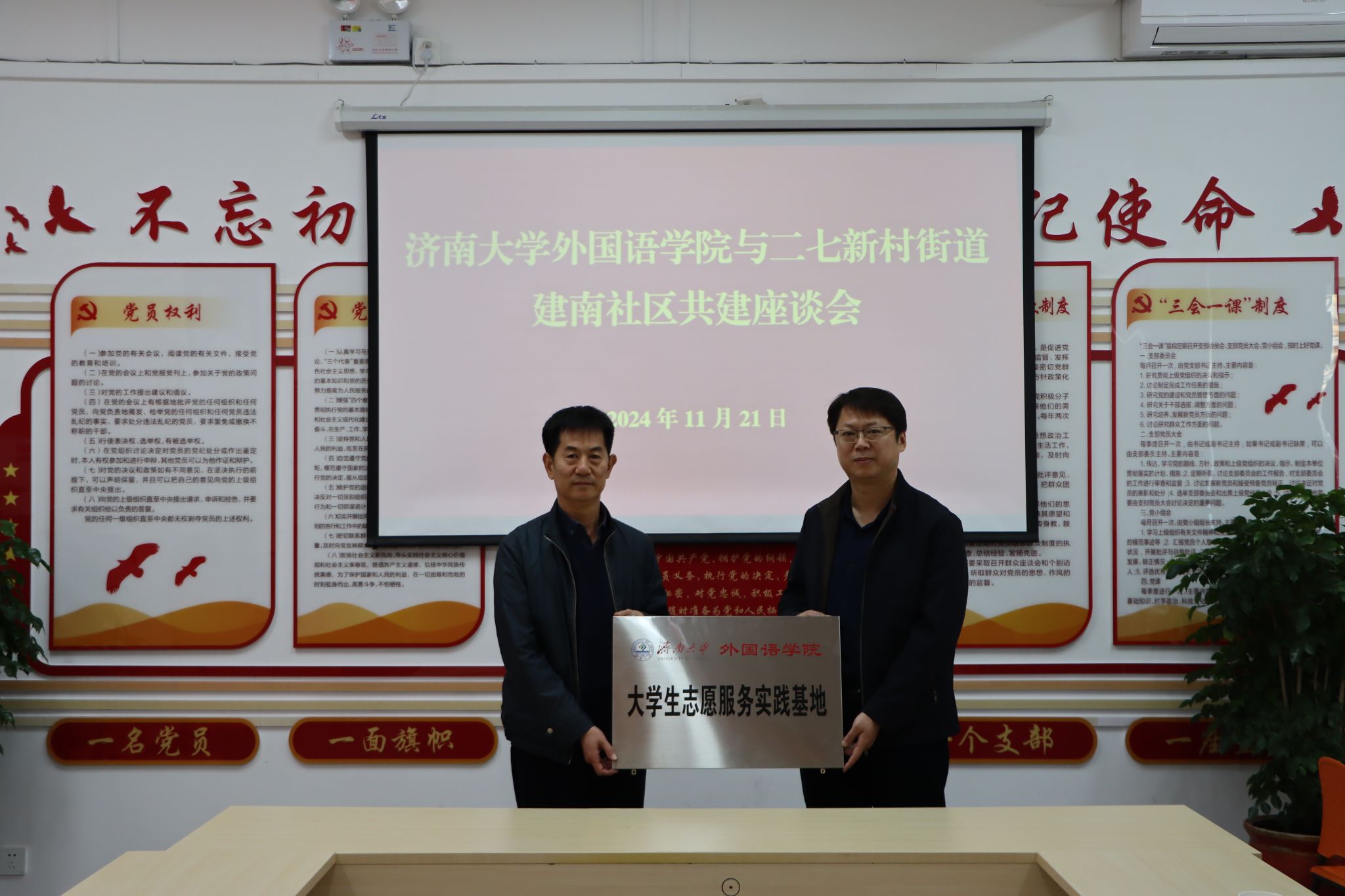 孟祥久与李春海共同为志愿服务实践基地揭牌。双方就志愿服务活动开展、校社资源共享、社区志愿服务岗设立等方面进行了深入的交流。