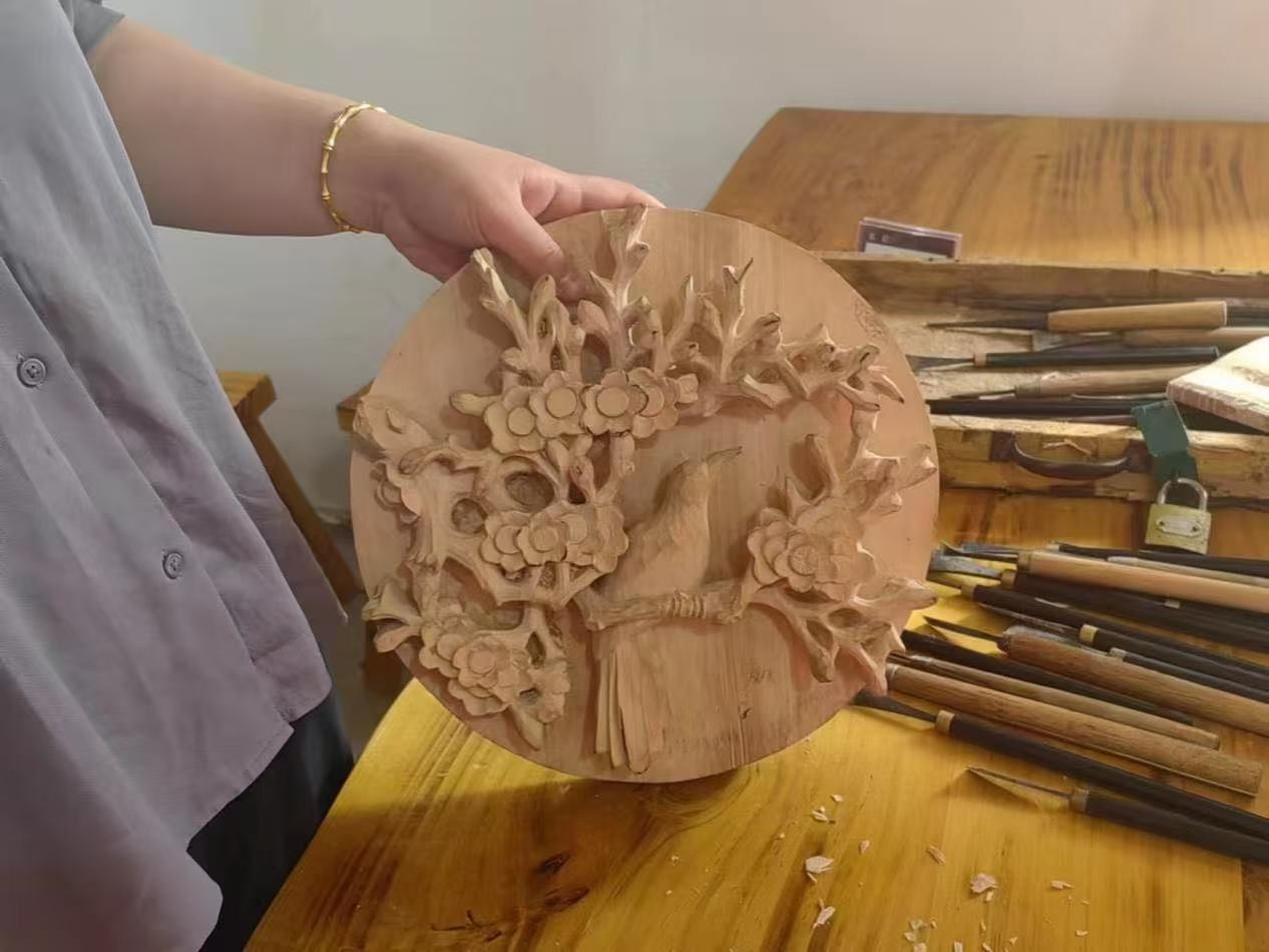 在解说老师的的引导下我们沿着山石砌成的台阶拾级而上。从细腻入微的剪纸艺术到技艺精湛的木雕作品,从韵味悠长的书画作品到妙趣横生的漆扇文化,每一项非遗技艺都承载着先辈们的智慧结晶和不懈努力。解说老师耐心细致地介绍了各项非遗技艺的历史源流、制作工艺和发展态势,使同学们对这些传统文化有了更为全面和深刻的认知与理解,更是被背后传承人的执着坚守与创新精神所深深打动。