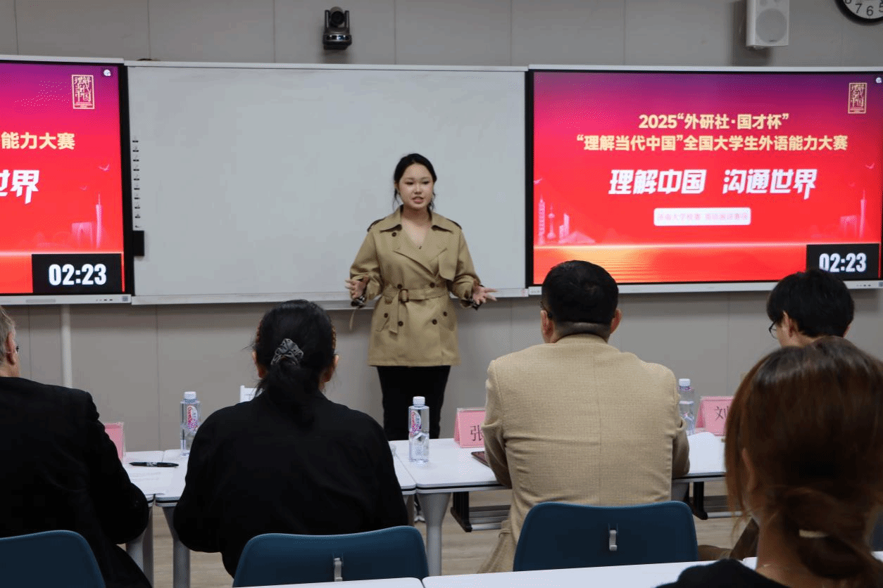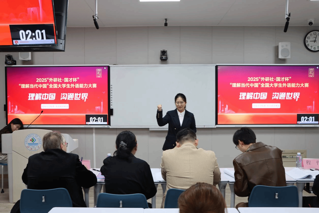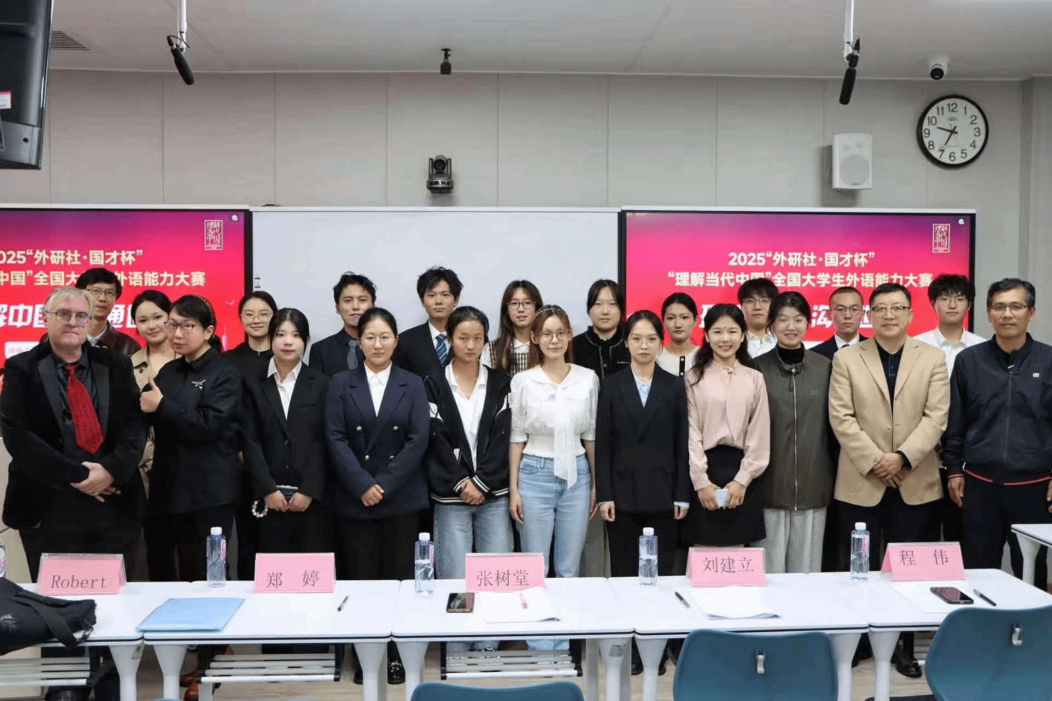 10月15日晚, 2025年“外研社·国才杯”“理解当代中国”全国大学生外语能力大赛英语演讲大赛校园赛在第一教学楼505成功举办。来自全校各学院的21名晋级选手同台竞技,他们在比赛现场各放异彩,展开了激烈又精彩的角逐。本次比赛邀请了问鼎(中国)张树堂、郑婷、刘建立、程伟和外籍教师Robert担任评委。