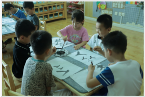 “小朋友们,你们认识这些帽子上有一颗闪闪红星的人吗?他们是我们的英雄,他们是红军战士。今天跟大家分享红军四渡赤水的故事。”实践团队成员以革命先烈的传奇故事引入,引导小朋友感受故事背后感人坚毅的革命精神和革命先辈的智慧,增强孩子们的爱国情感,争做新时代的“闪闪红星”。