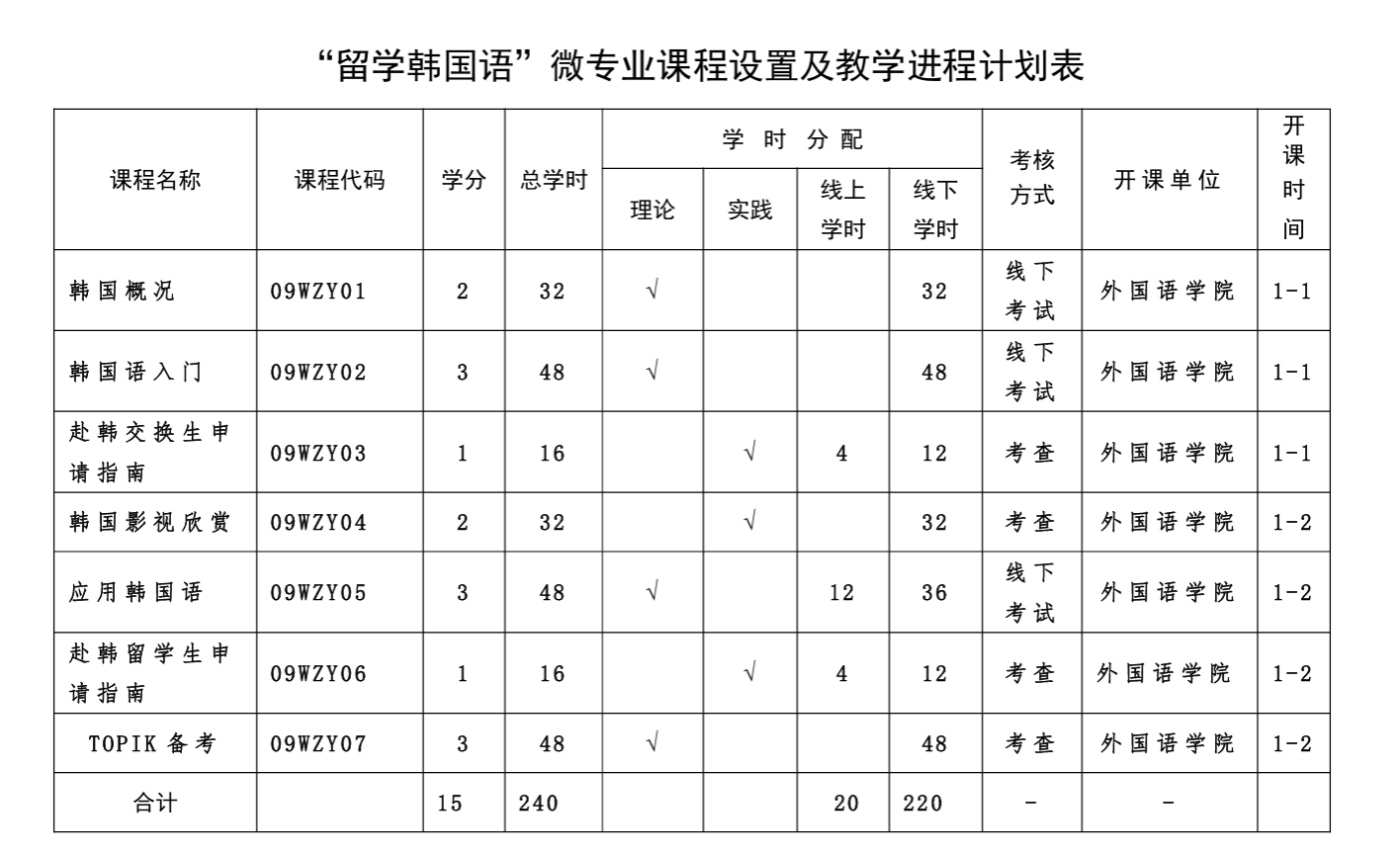 “留学韩国语”微专业课程修读时间为1学年。成绩单独管理,不计入主修专业成绩单。完成全部课程修满学分的同学可获得我校颁发的“留学韩国语”